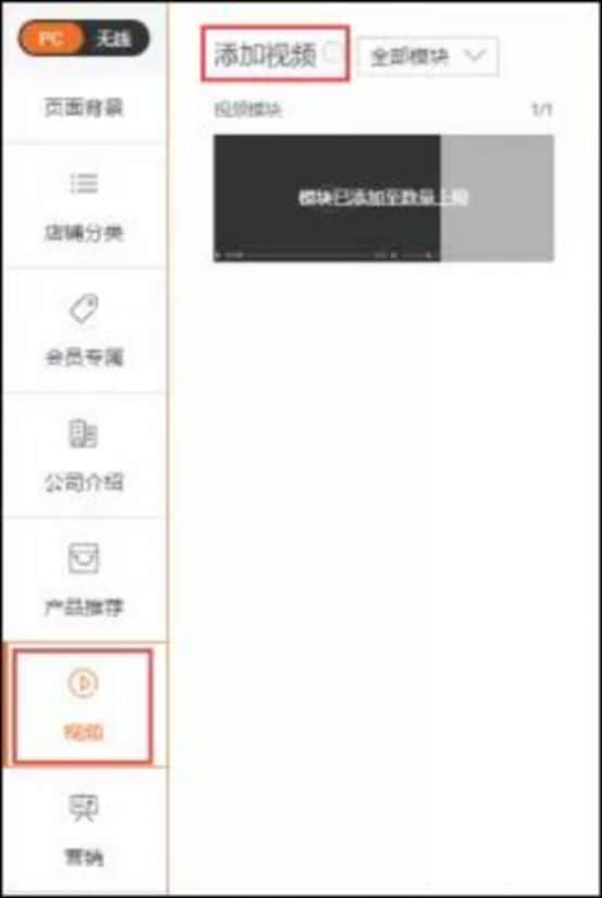 進入旺鋪2.0 PC旺鋪首頁/自定義頁的編輯器,在左側導航欄的【視頻】模塊中,拖拽并添加到裝修展示區。
